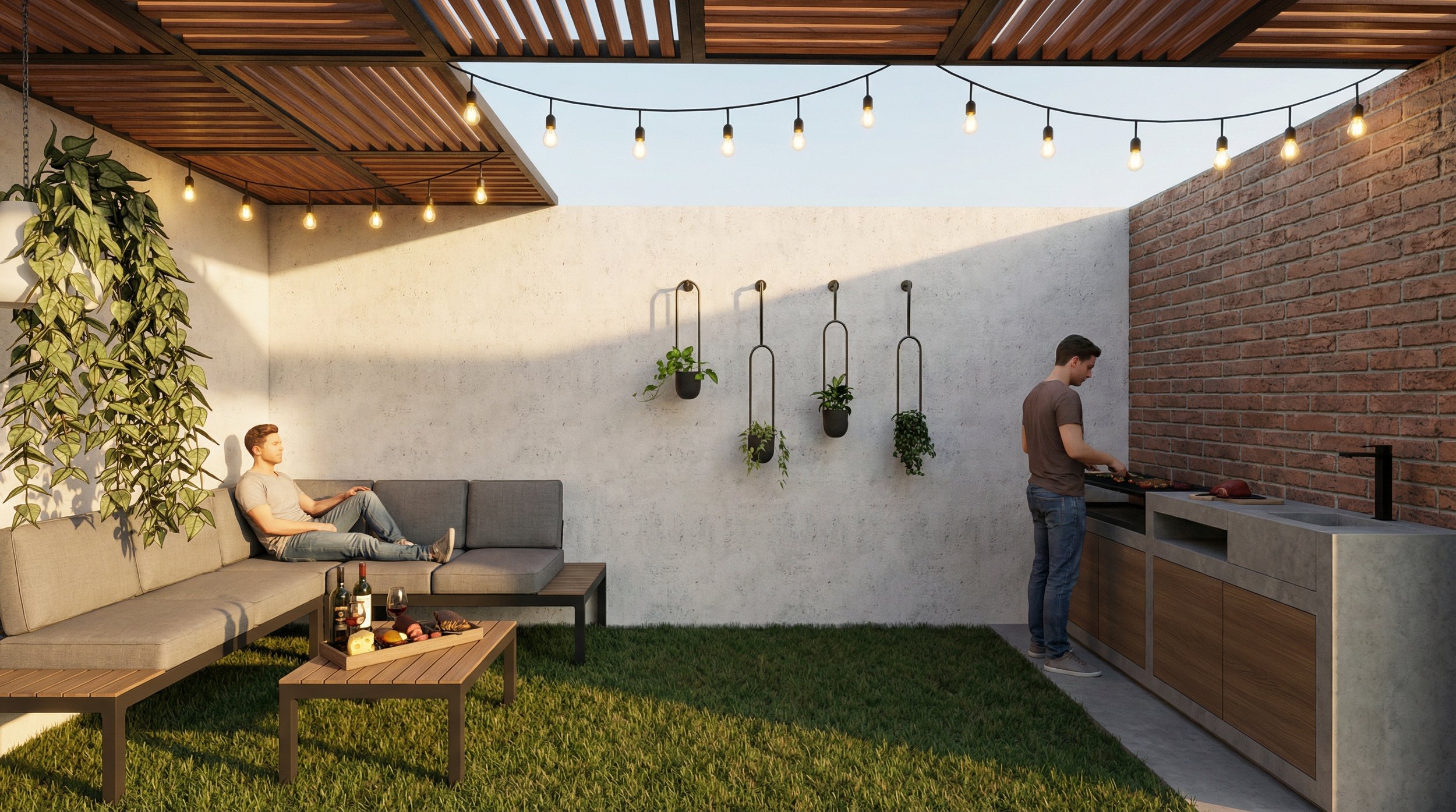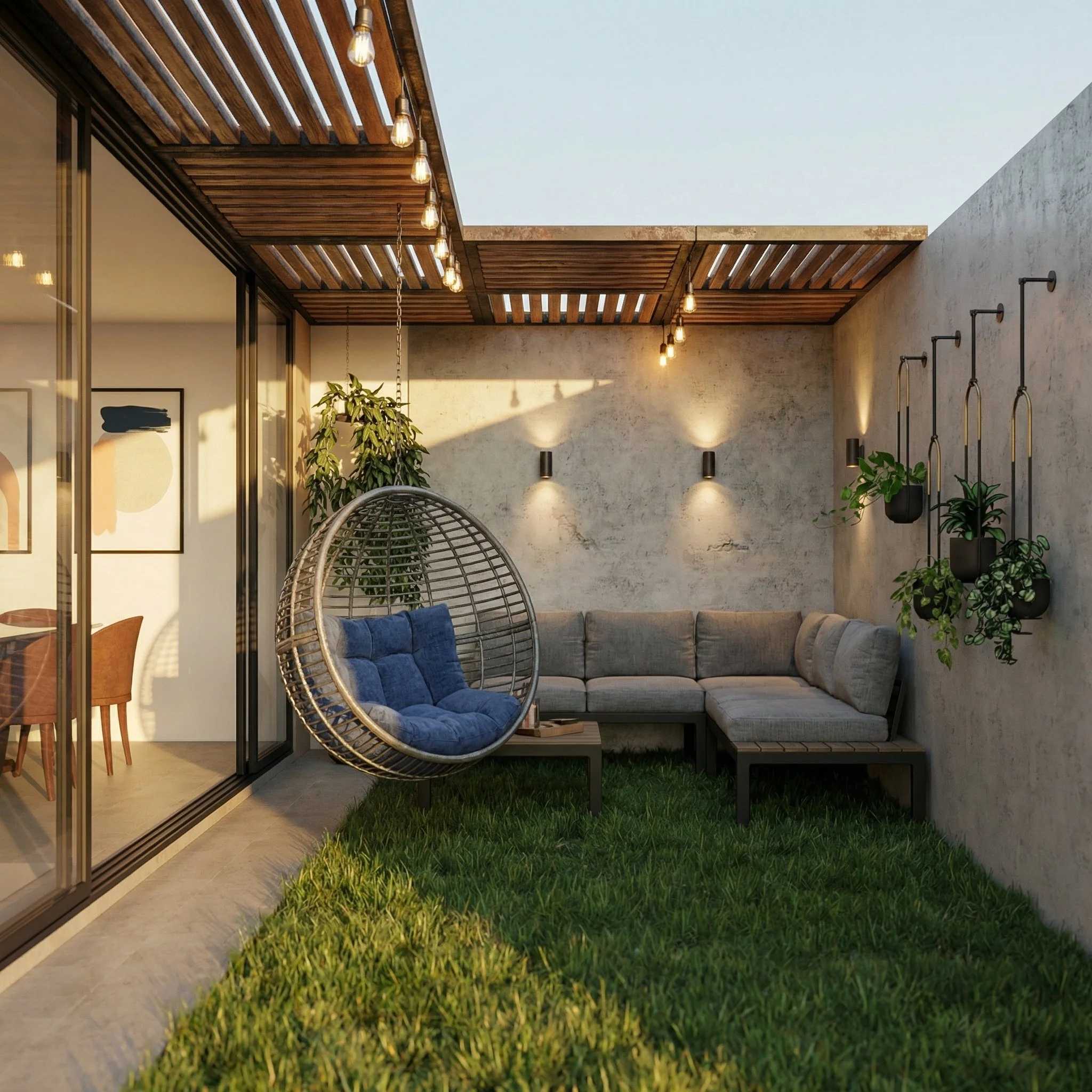 Proyecto de remodelación de patio enfocado en la creación de un área social exterior. La propuesta integró diseño, mobiliario e iluminación para transformar el espacio en un entorno funcional y acogedor. Se incorporó un jardín, un muro verde como elemento protagónico, una silla colgante y un área de asador, generando un espacio pensado para la convivencia y las reuniones del cliente.